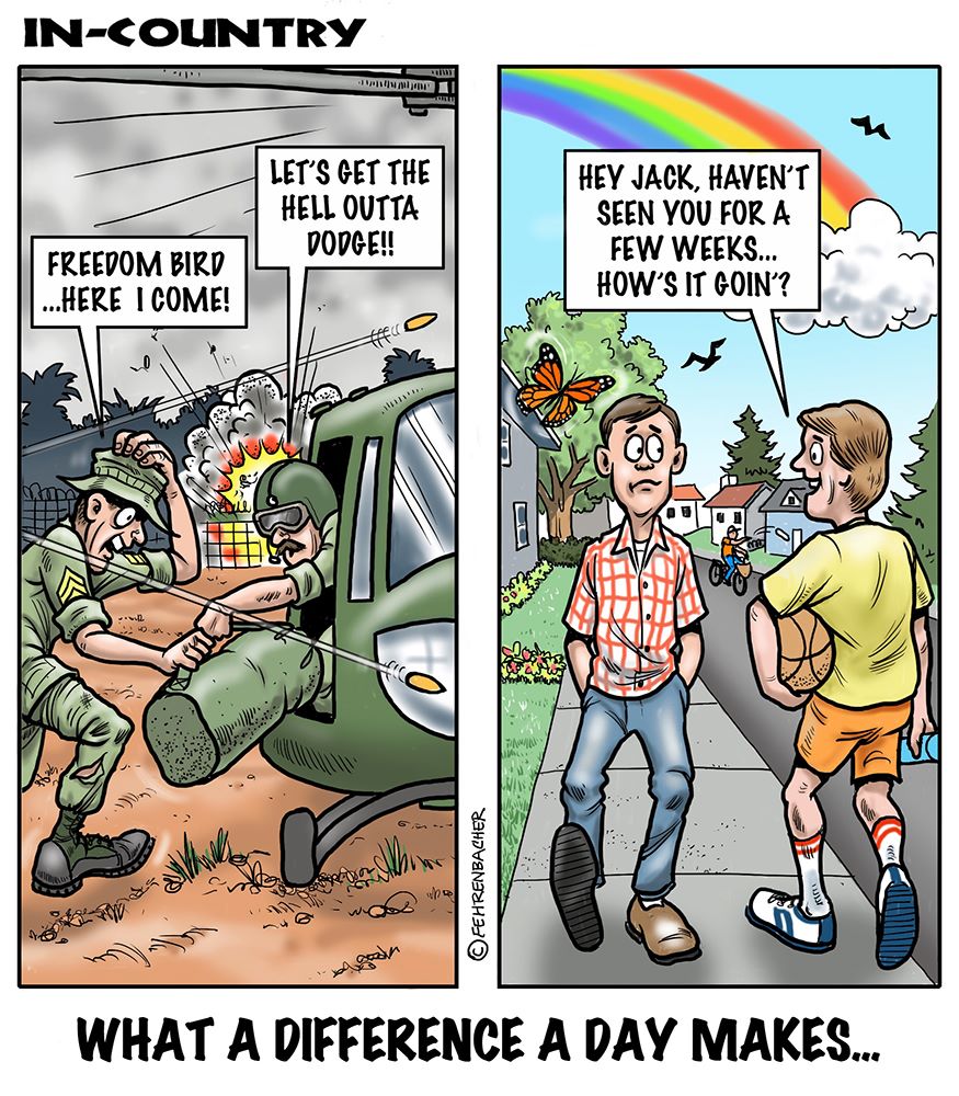 Phil enlisted in the Army in 1965 where you served for years in Vietnam. He became a graphic designer and has worked for the state of Oregon for 26 years. He retired in 2003 and started the Cartoon "In-Country". The cartoons reflect his experiences during his tour of duty in South Vietnam.